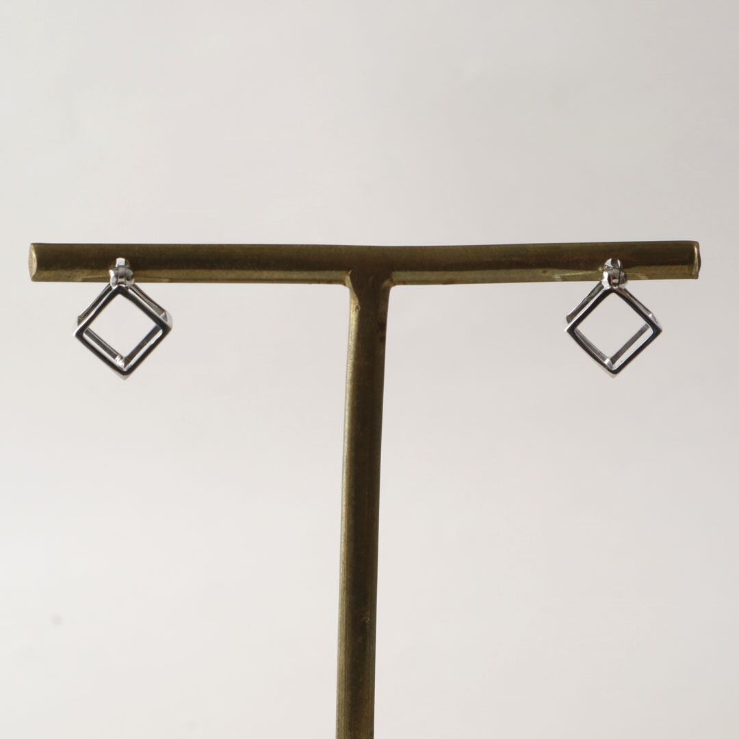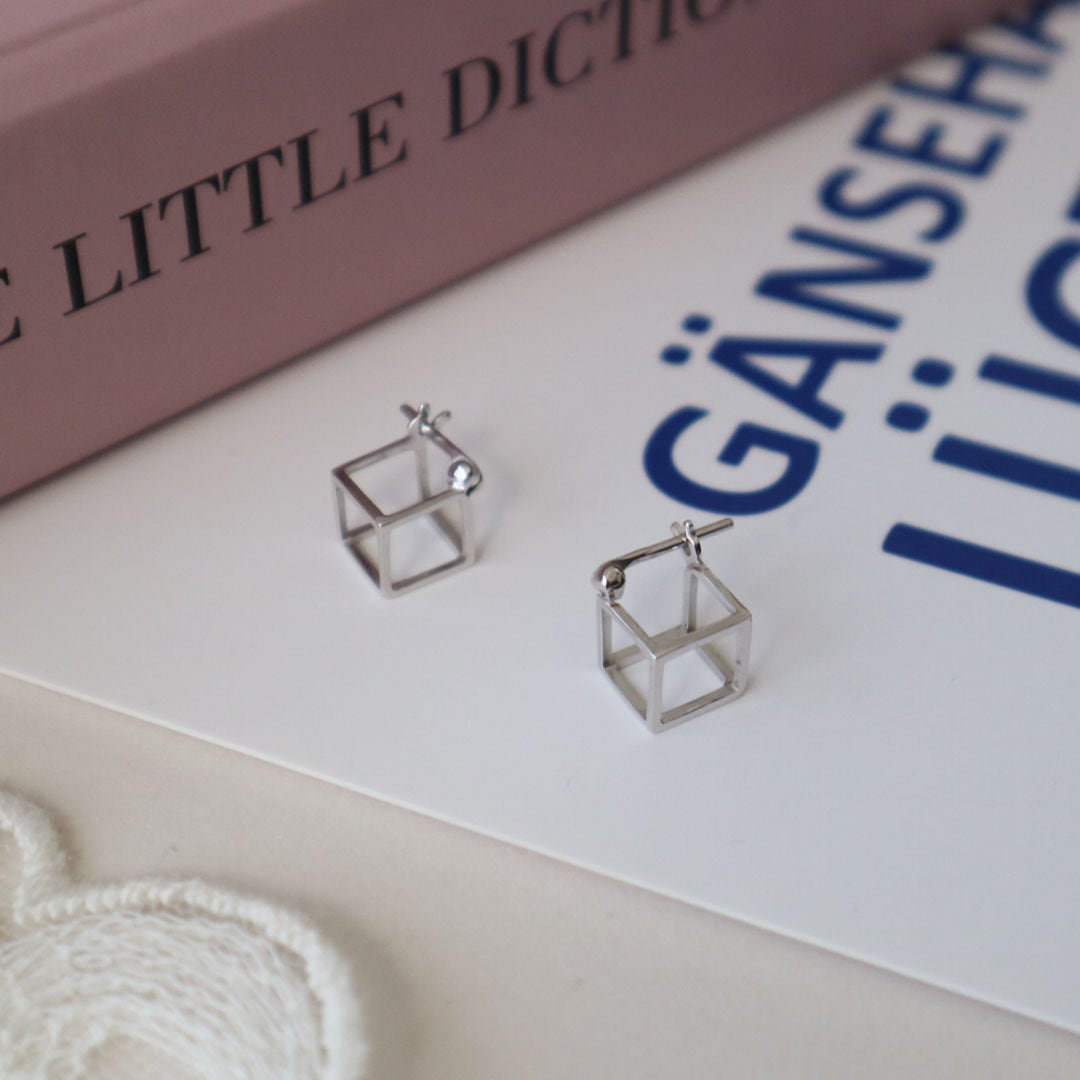 立体的なスクエアデザインが印象的な、スタイリッシュなシルバーピアスです。