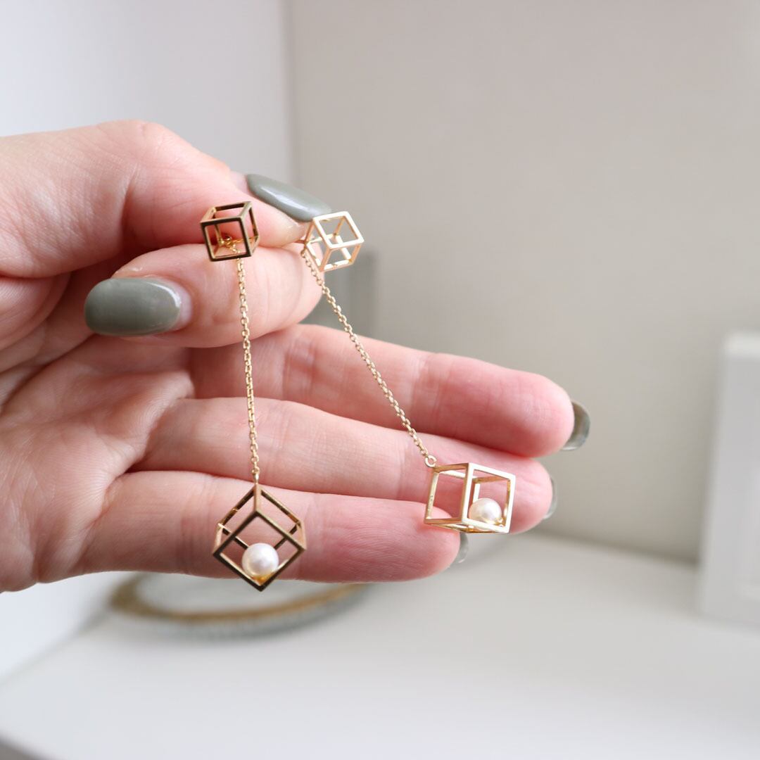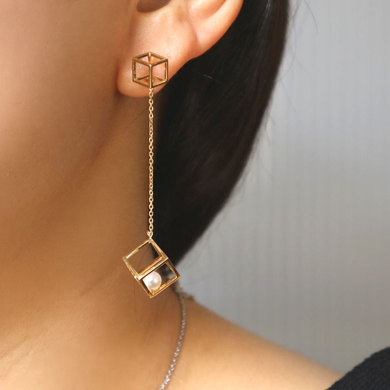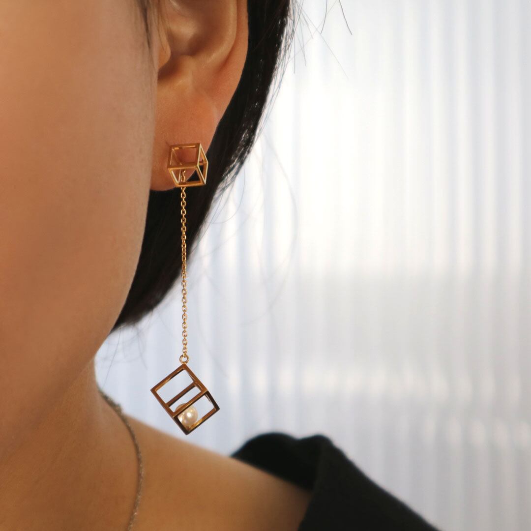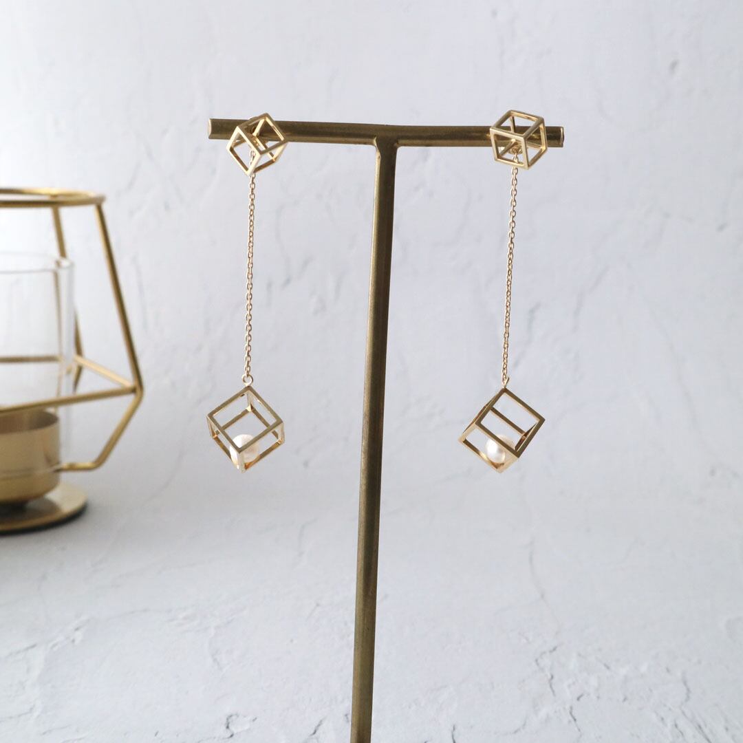 立体のスクエア型チャームが揺れることで演出される女性らしい雰囲気と、他にない個性的なデザインのピアスです。