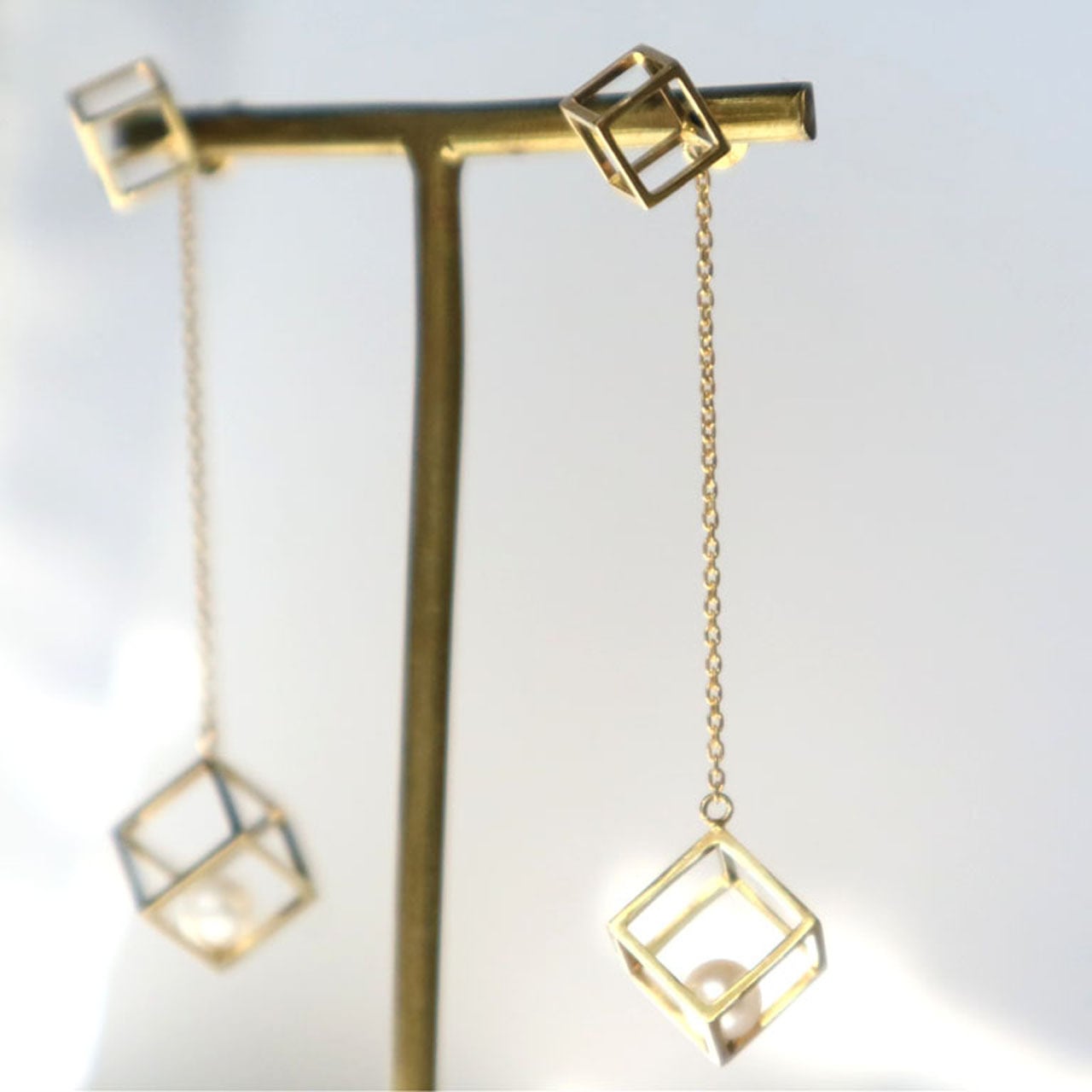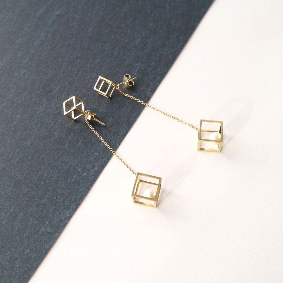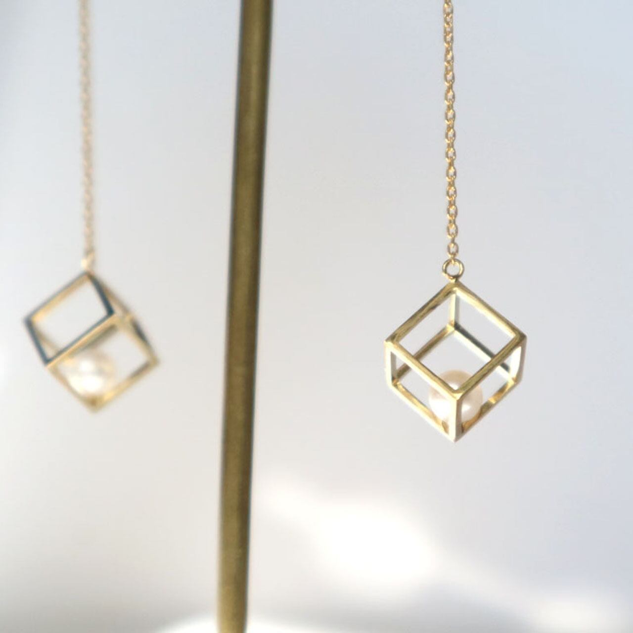 立体のスクエア型チャームが揺れることで演出される女性らしい雰囲気と、他にない個性的なデザインのピアスです。