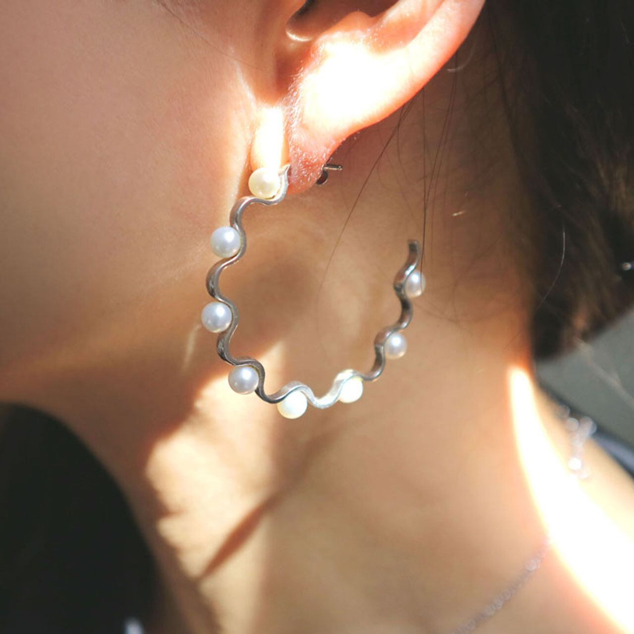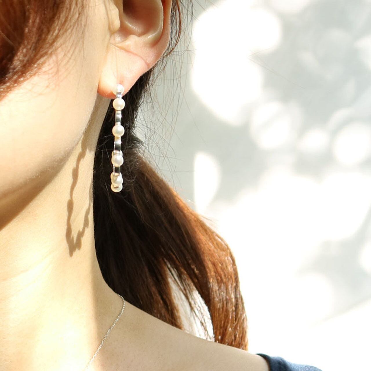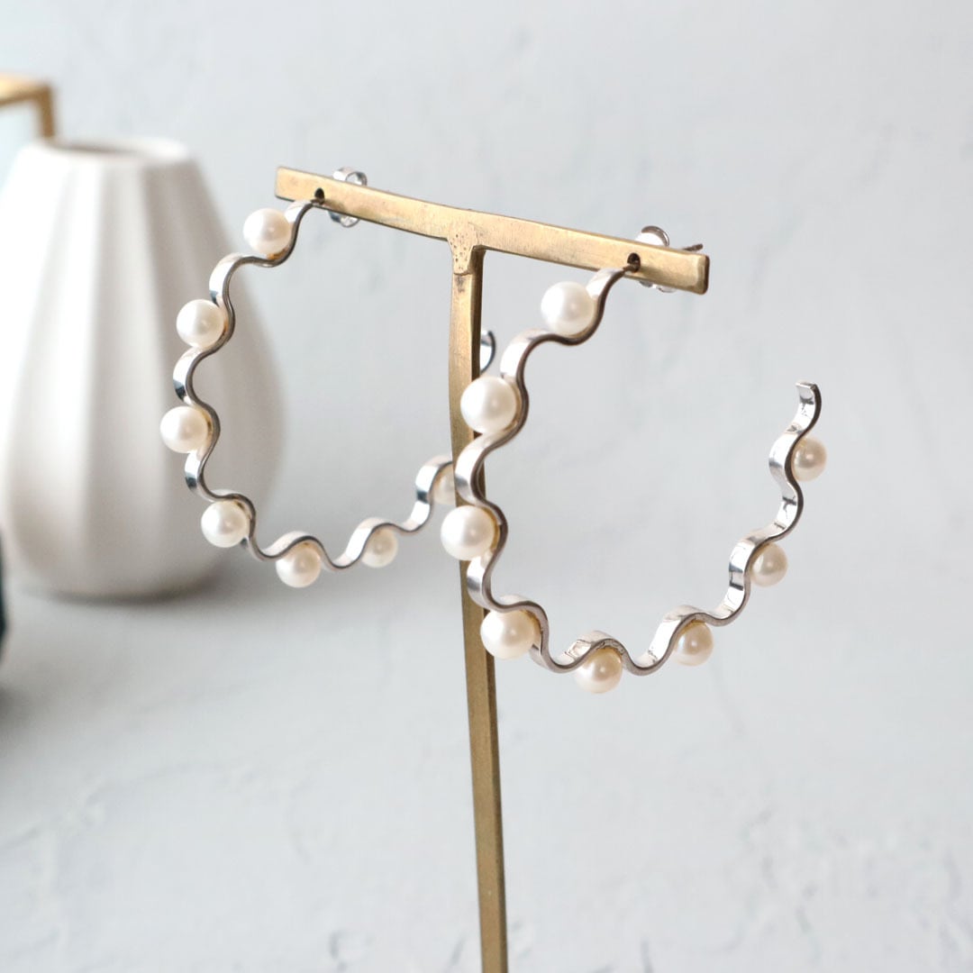 流れる波のような動きをイメージさせるデザインのピアスにパールが付いたことで、