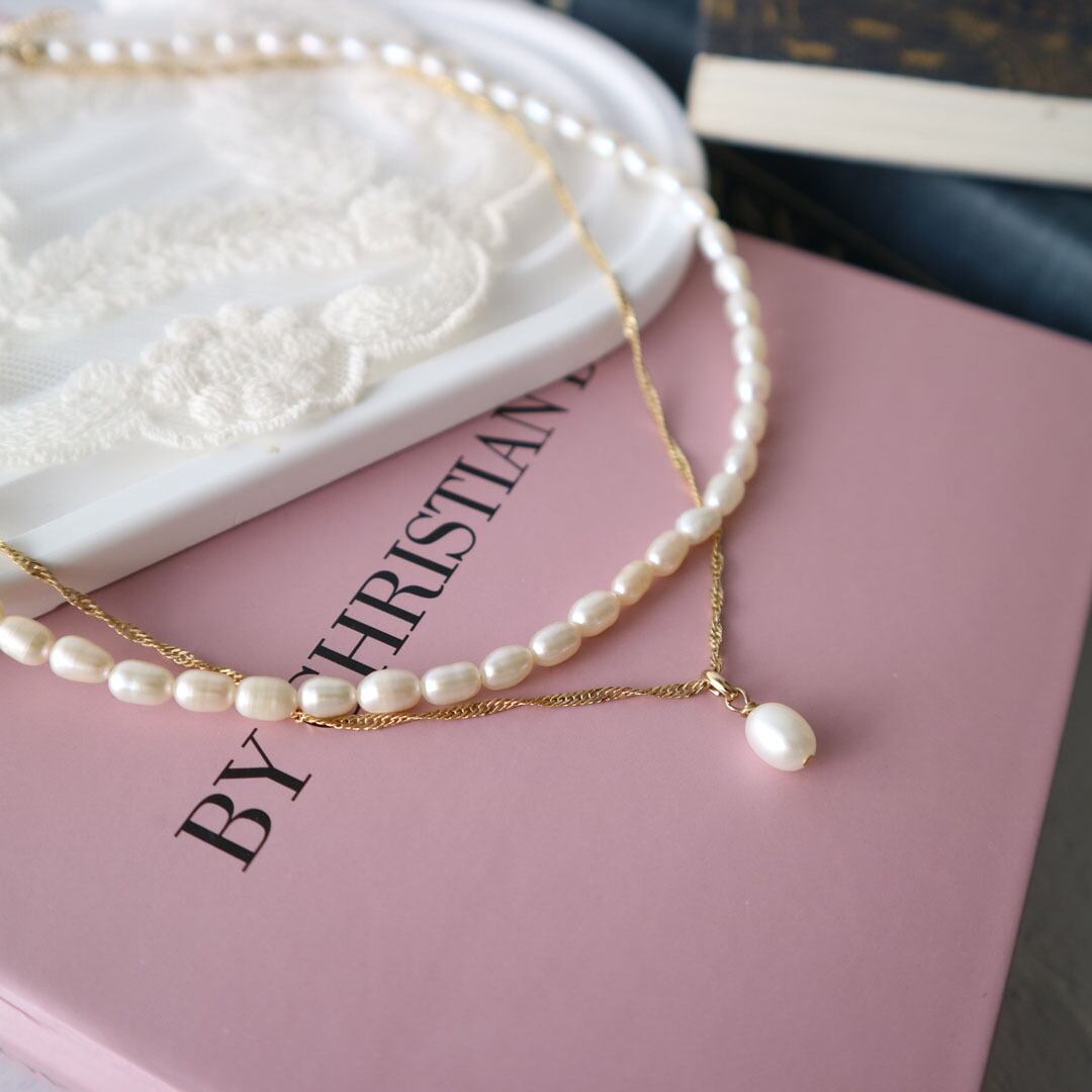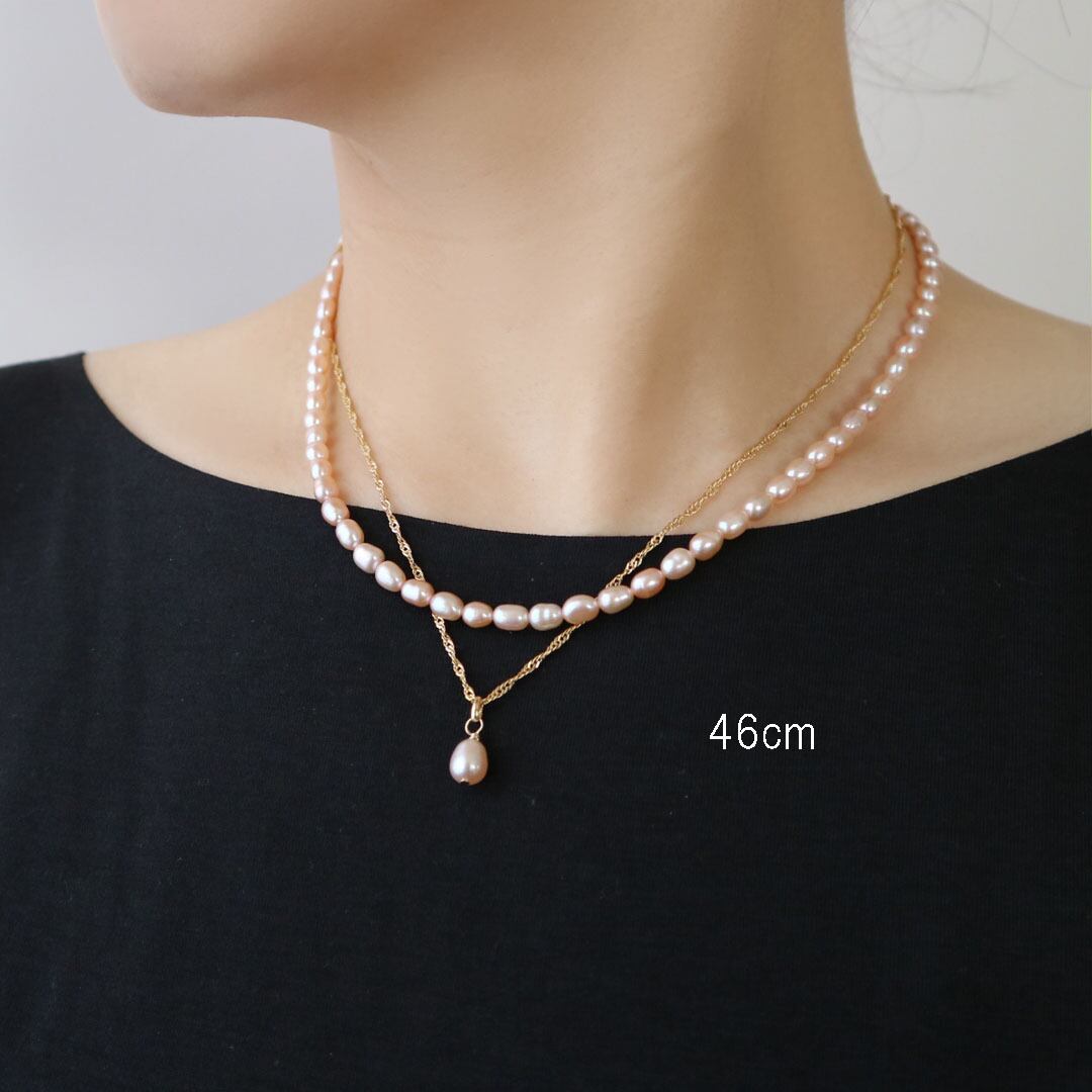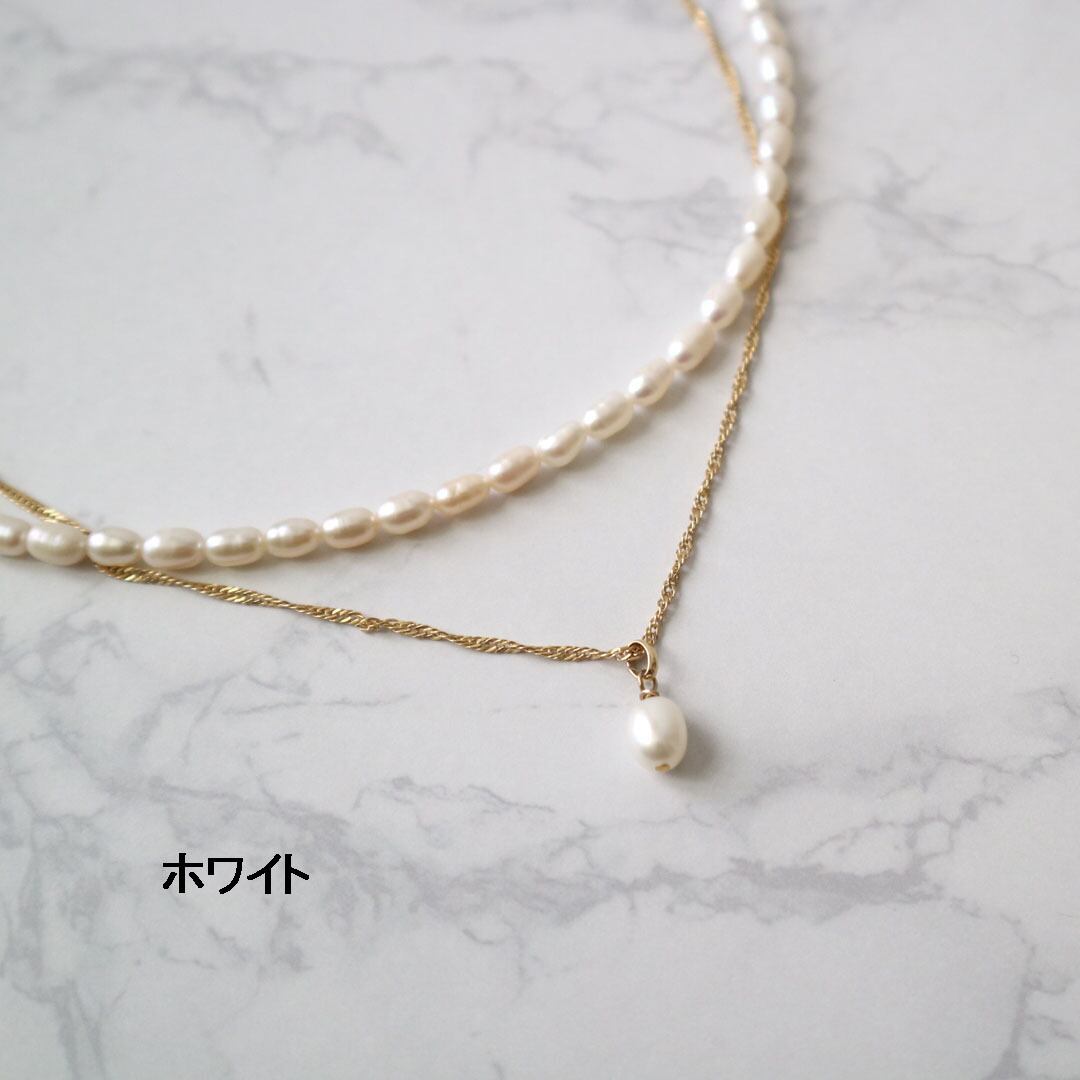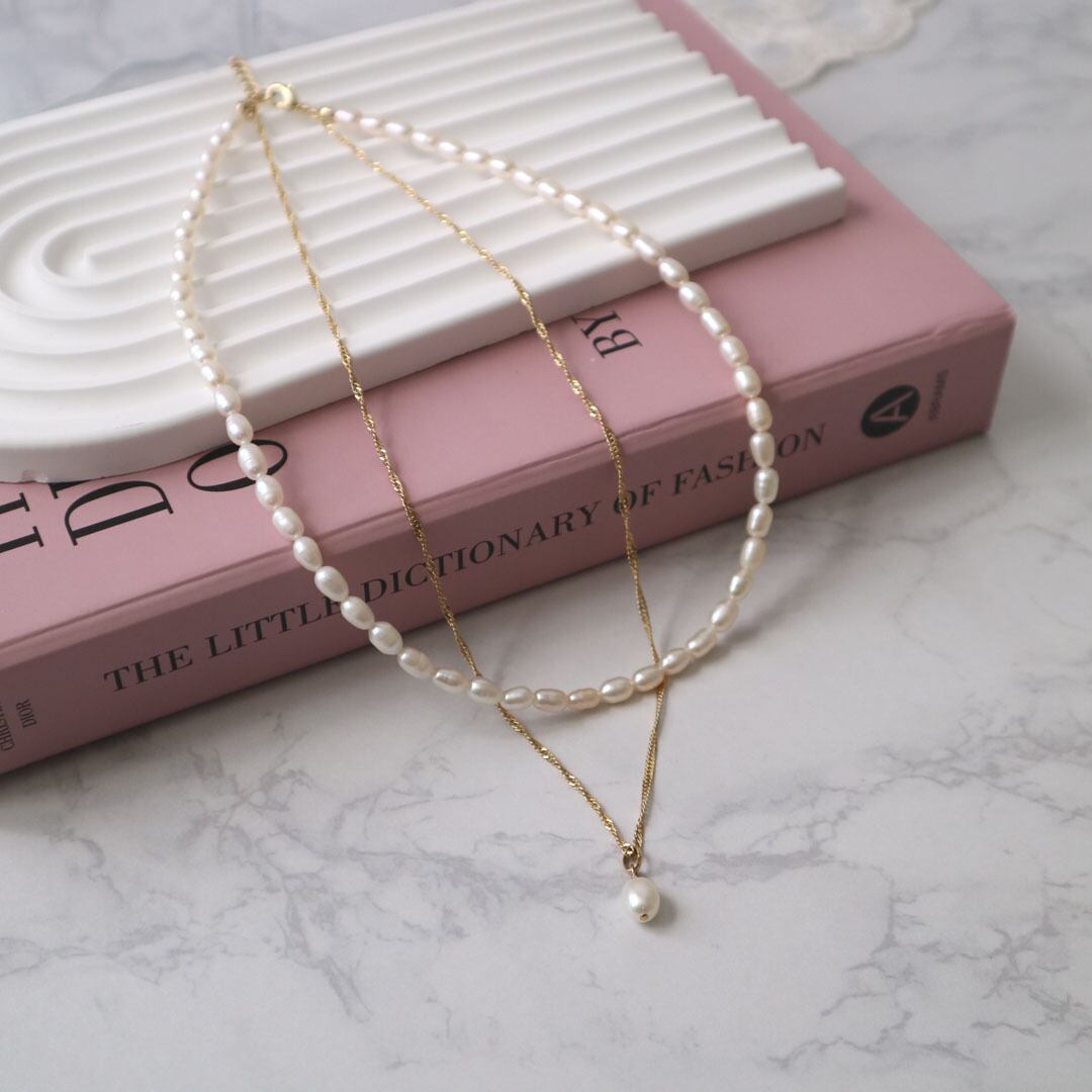 淡水パールとエレガントなチェーンが織りなす美しい2連ネックレス。