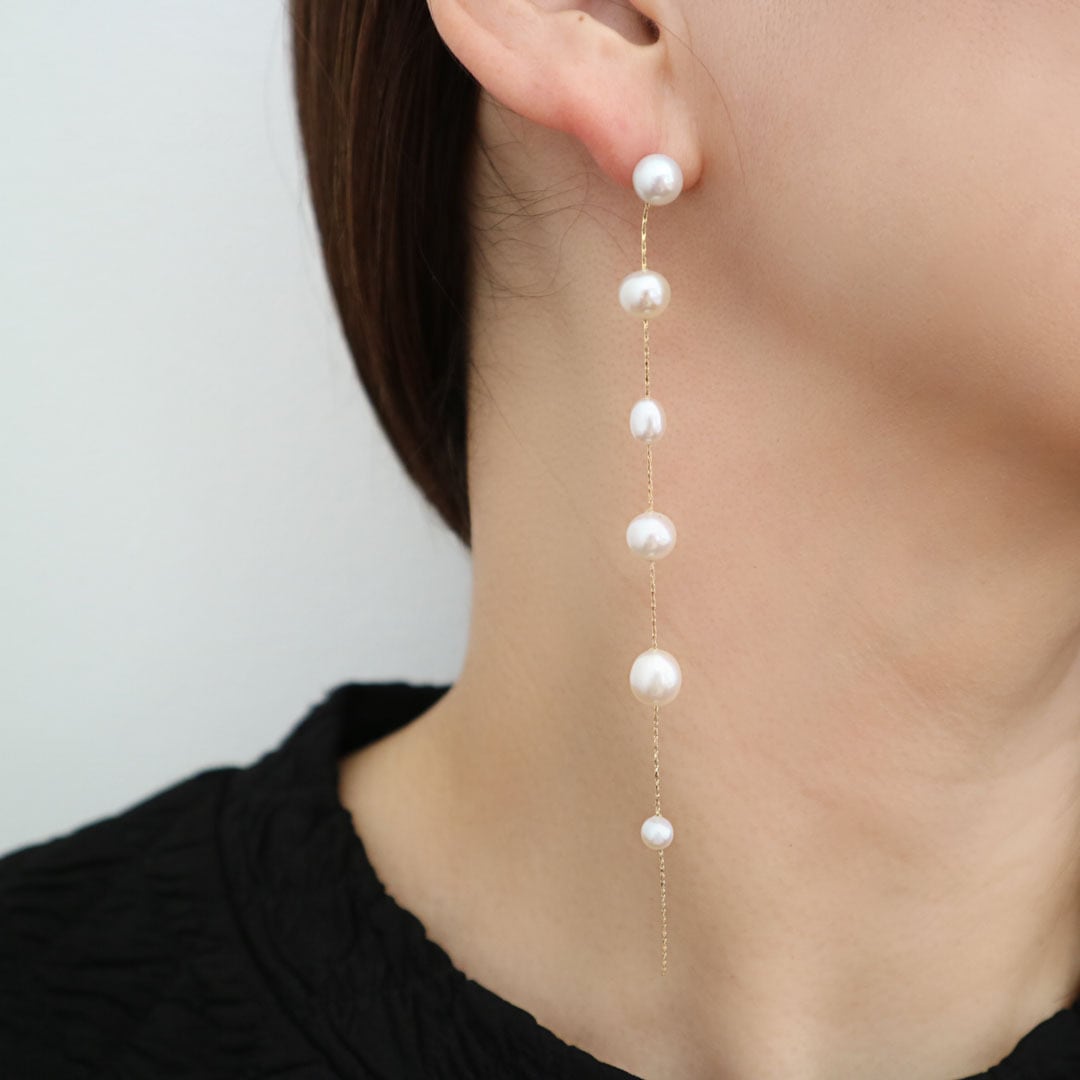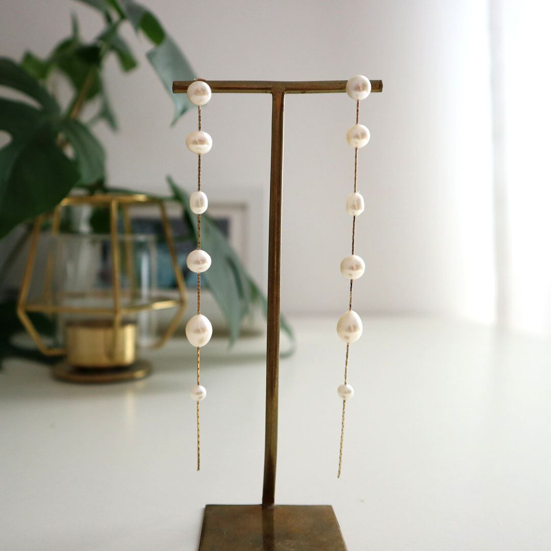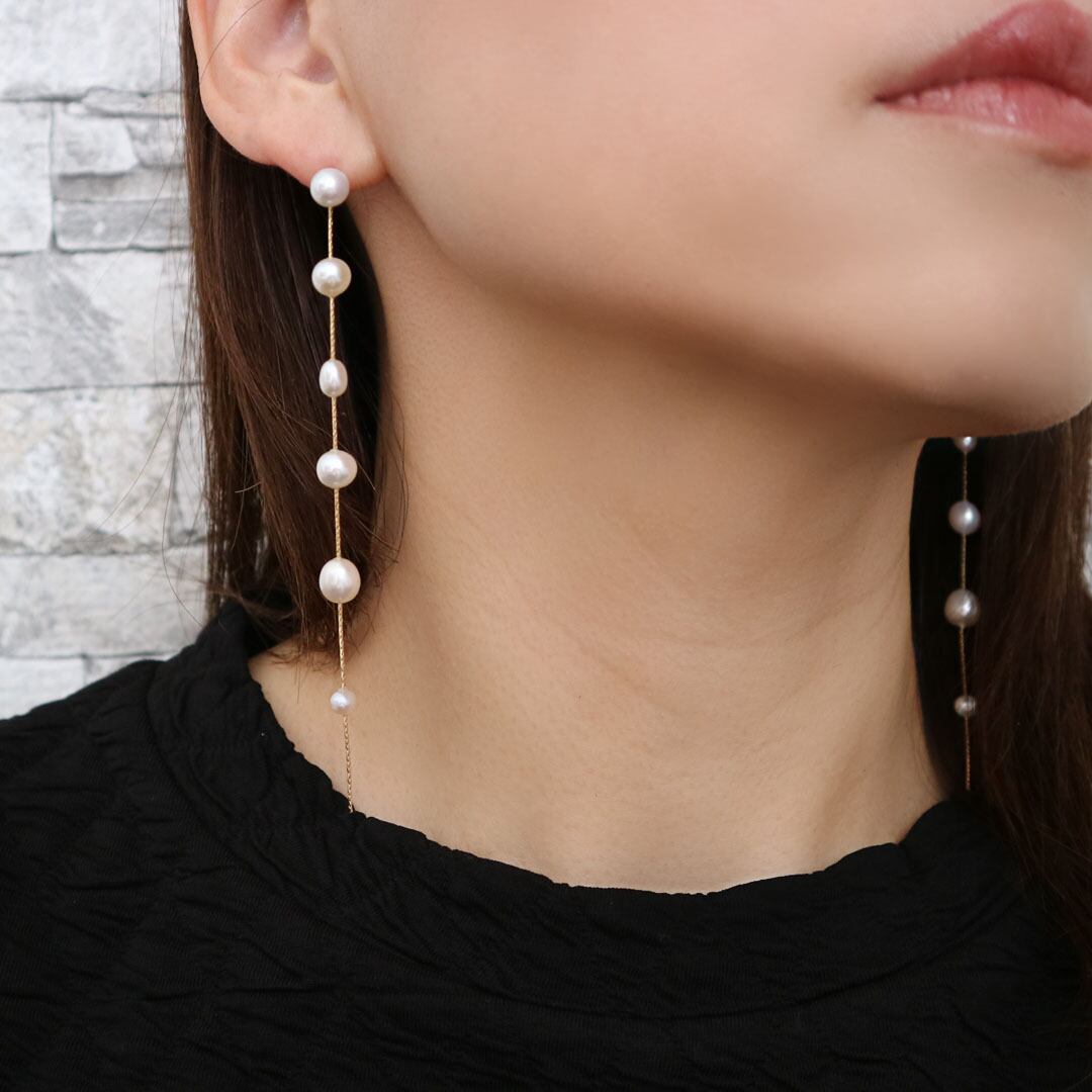 不揃いでナチュラルな淡水パールが連なるな女性らしいロングピアス。