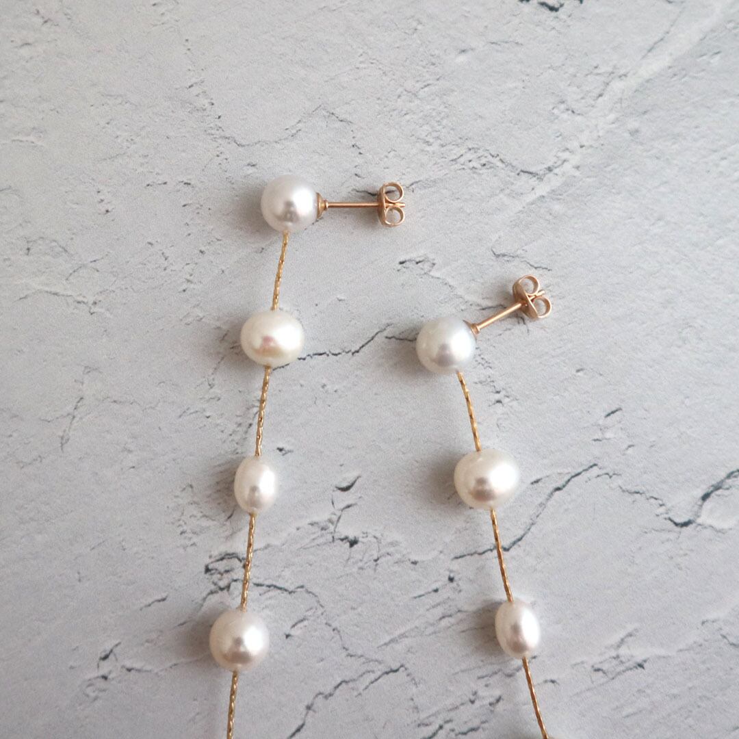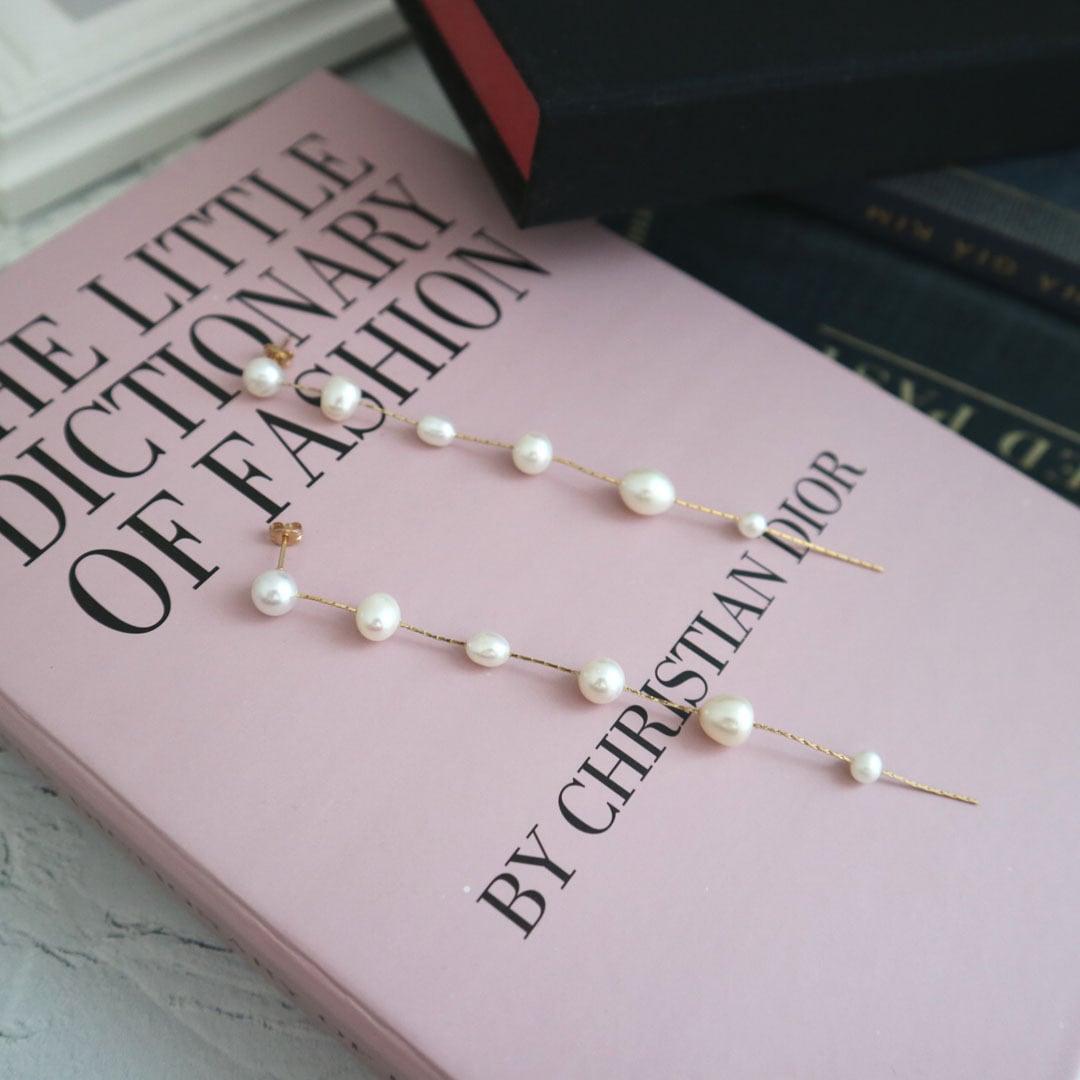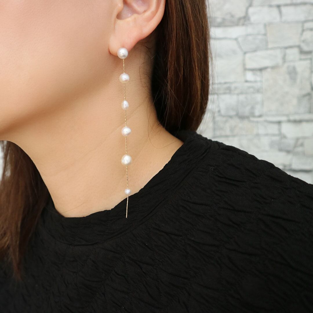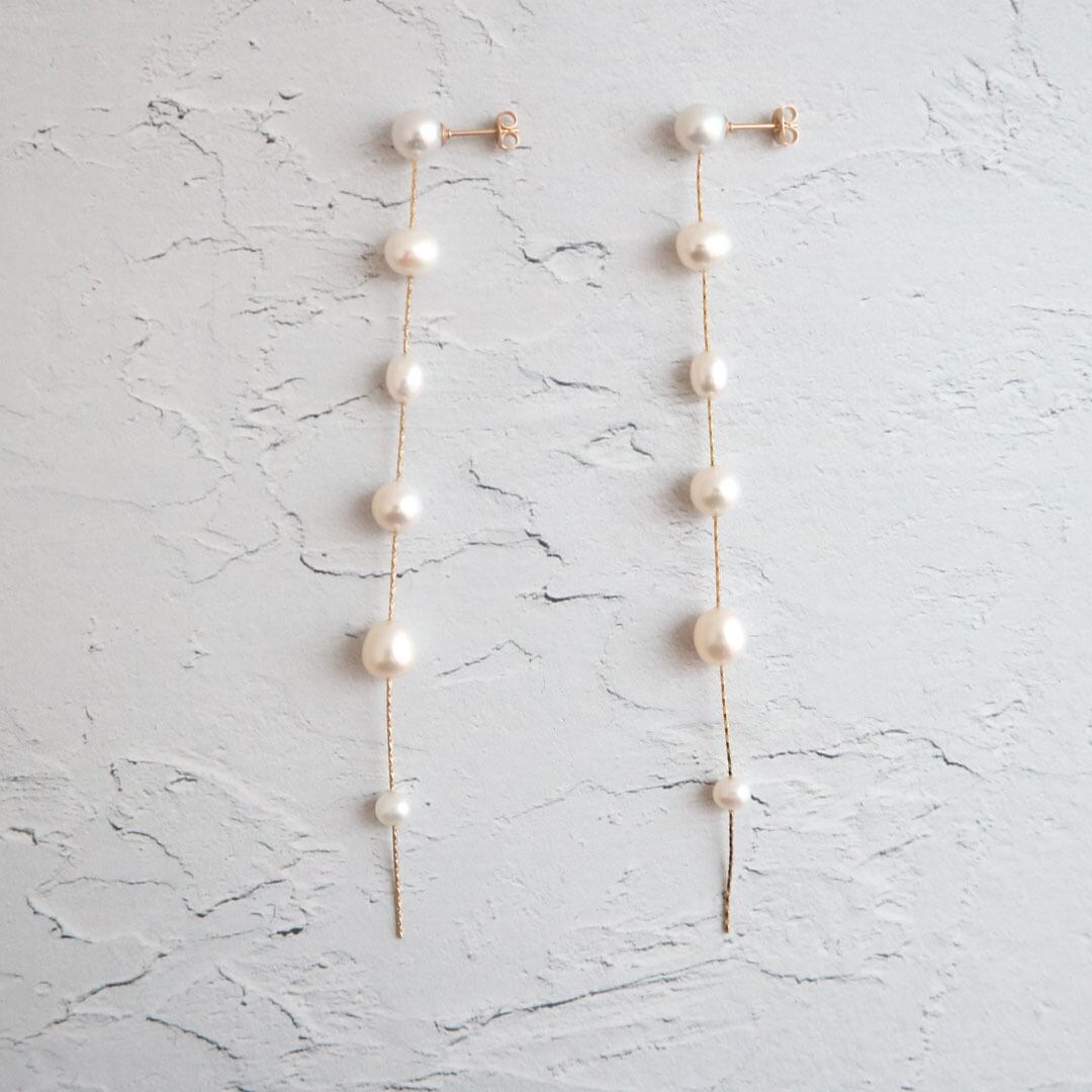 不揃いでナチュラルな淡水パールが連なるな女性らしいロングピアス。