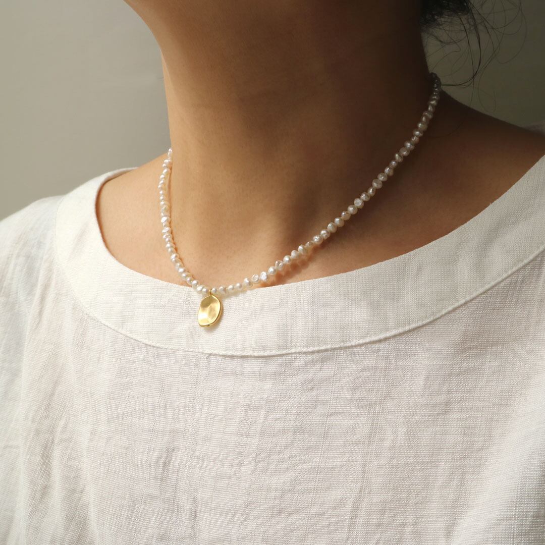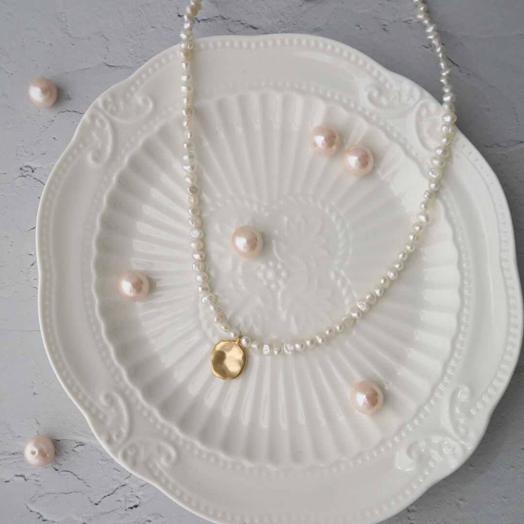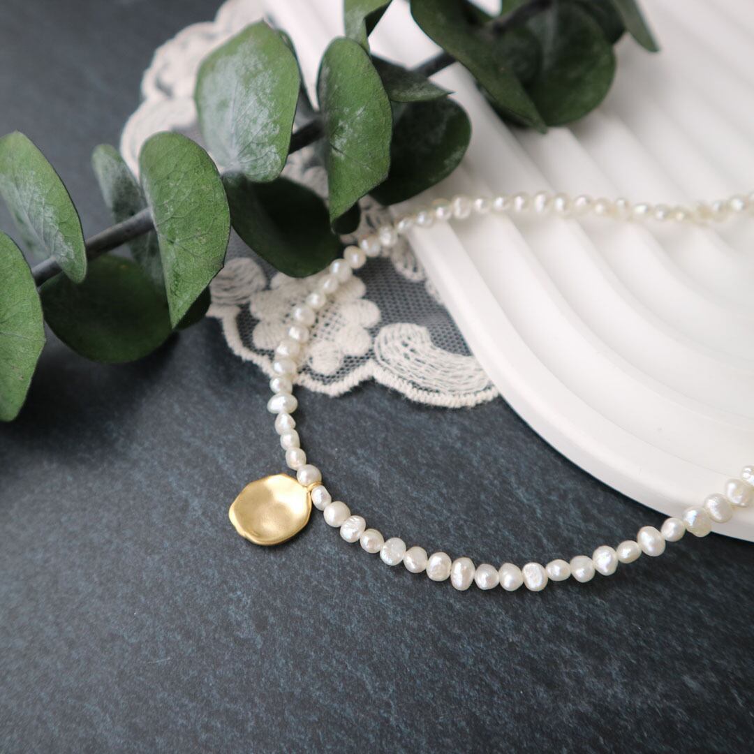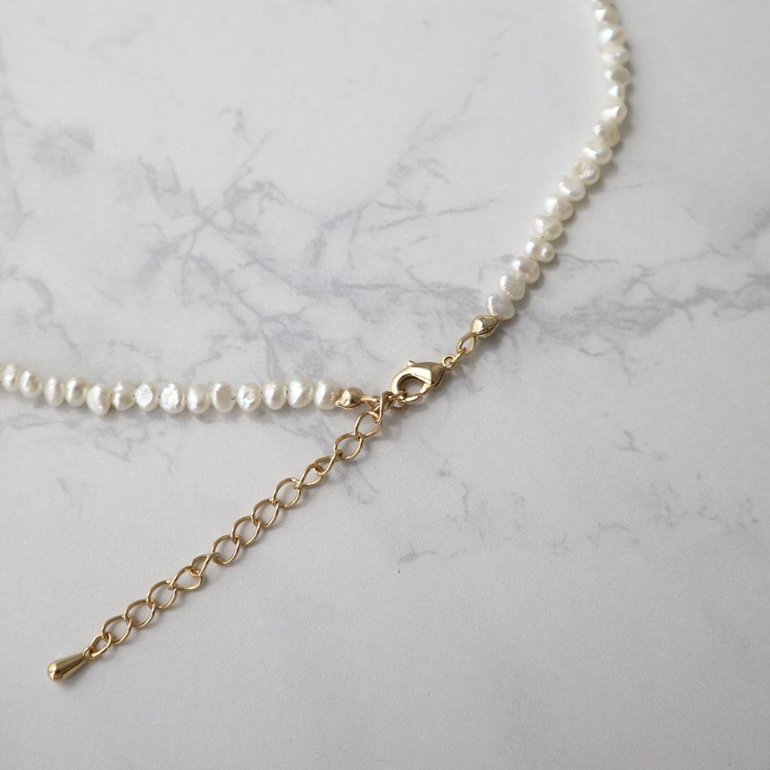 不揃いで小粒の淡水パールが首のラインに沿うように一周されたネックレスです。