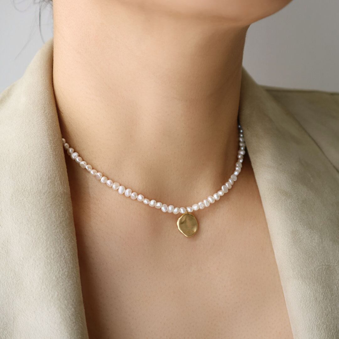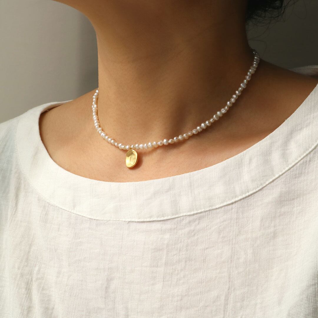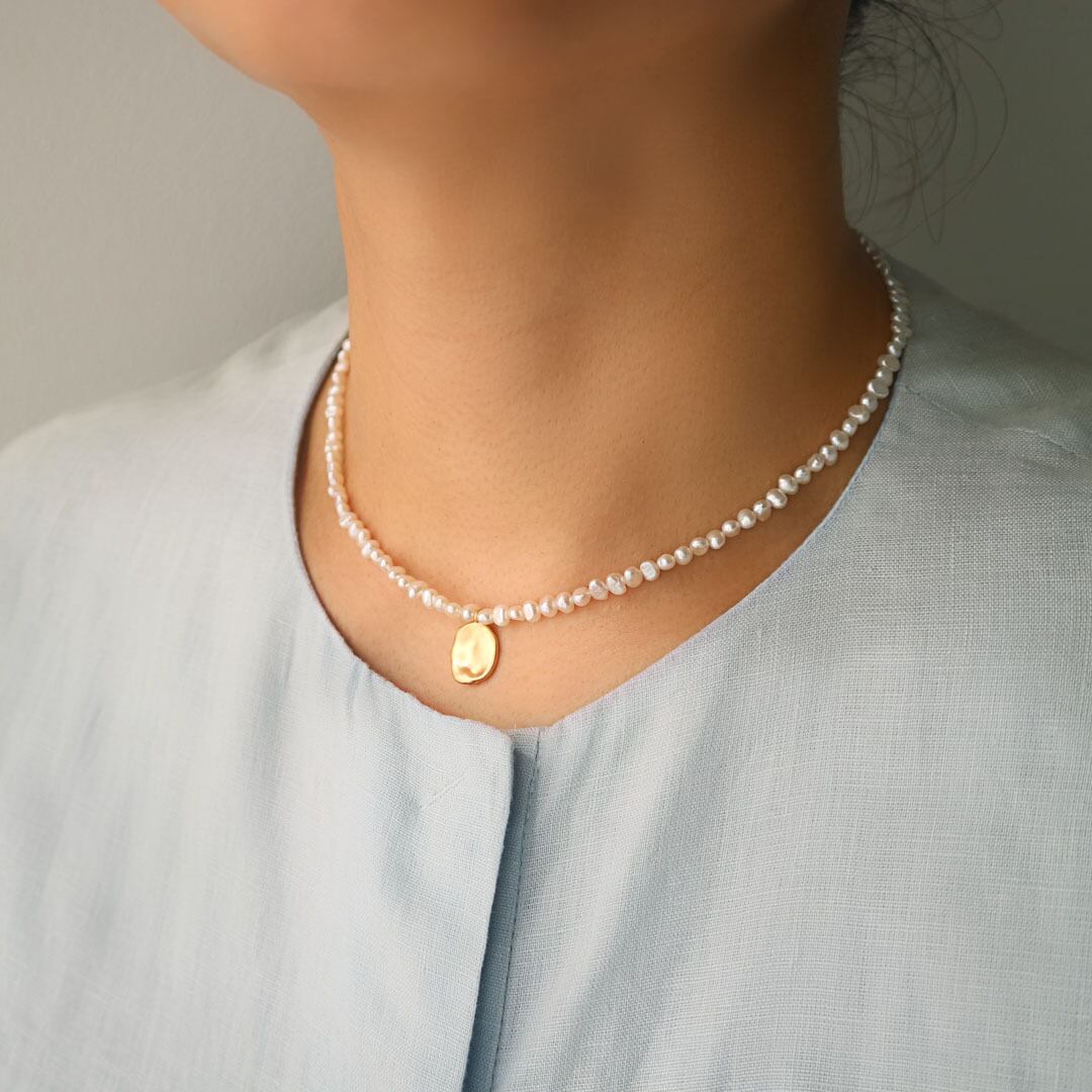 不揃いで小粒の淡水パールが首のラインに沿うように一周されたネックレスです。