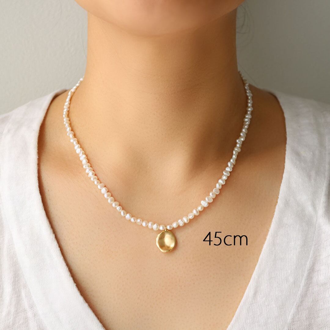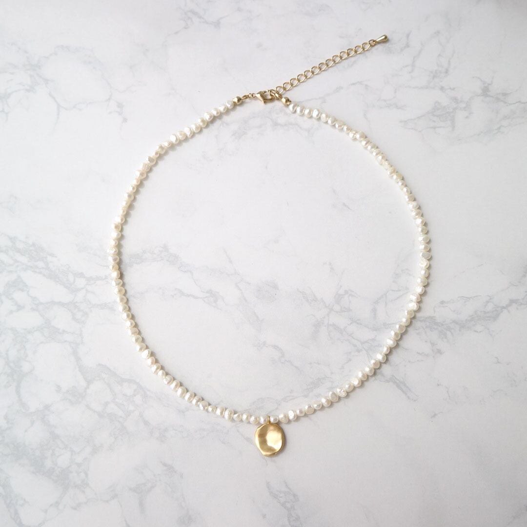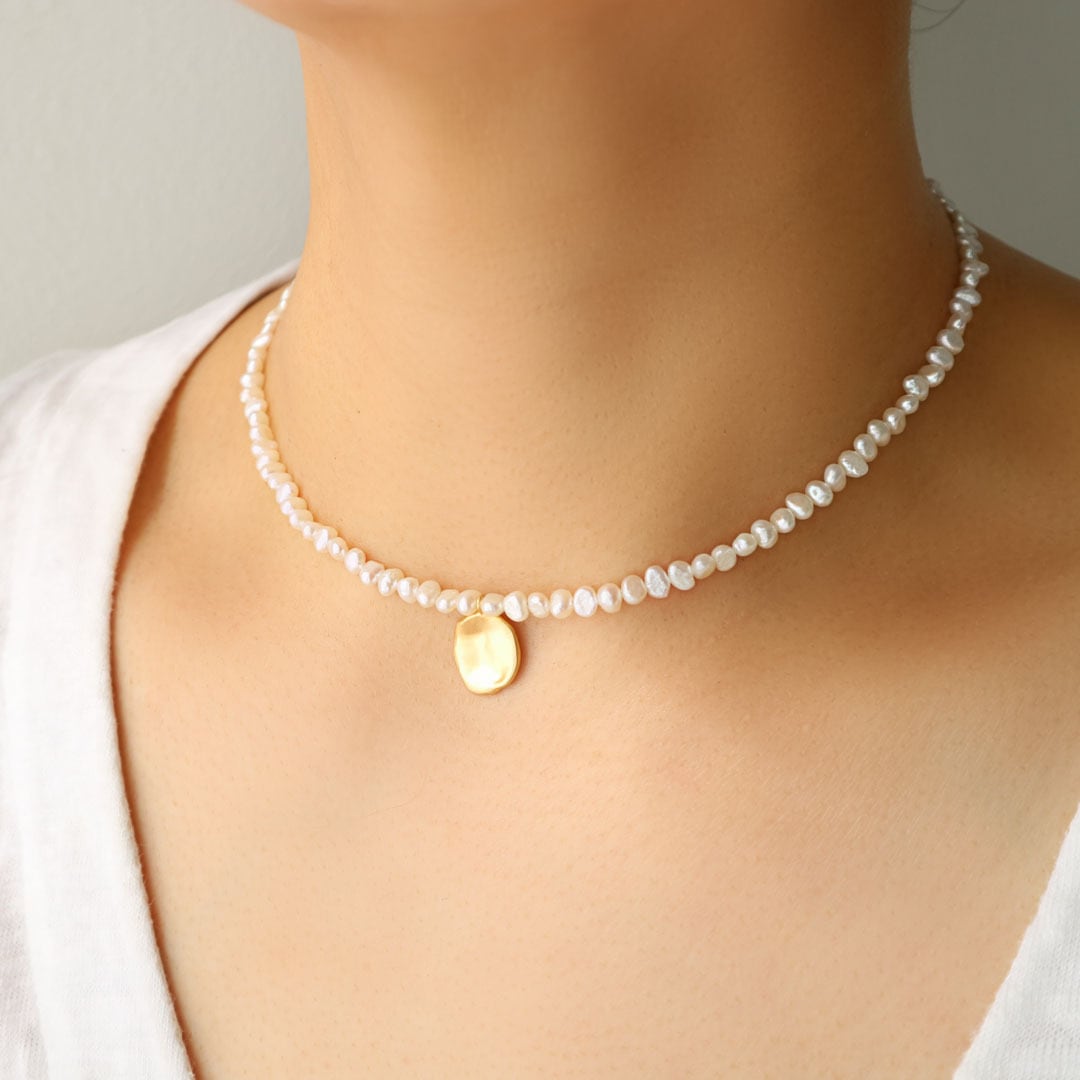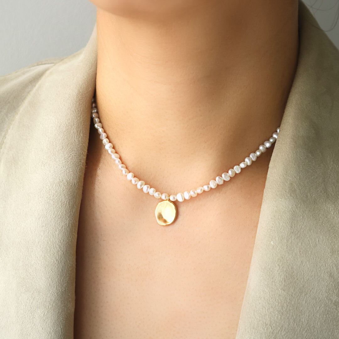 不揃いで小粒の淡水パールが首のラインに沿うように一周されたネックレスです。