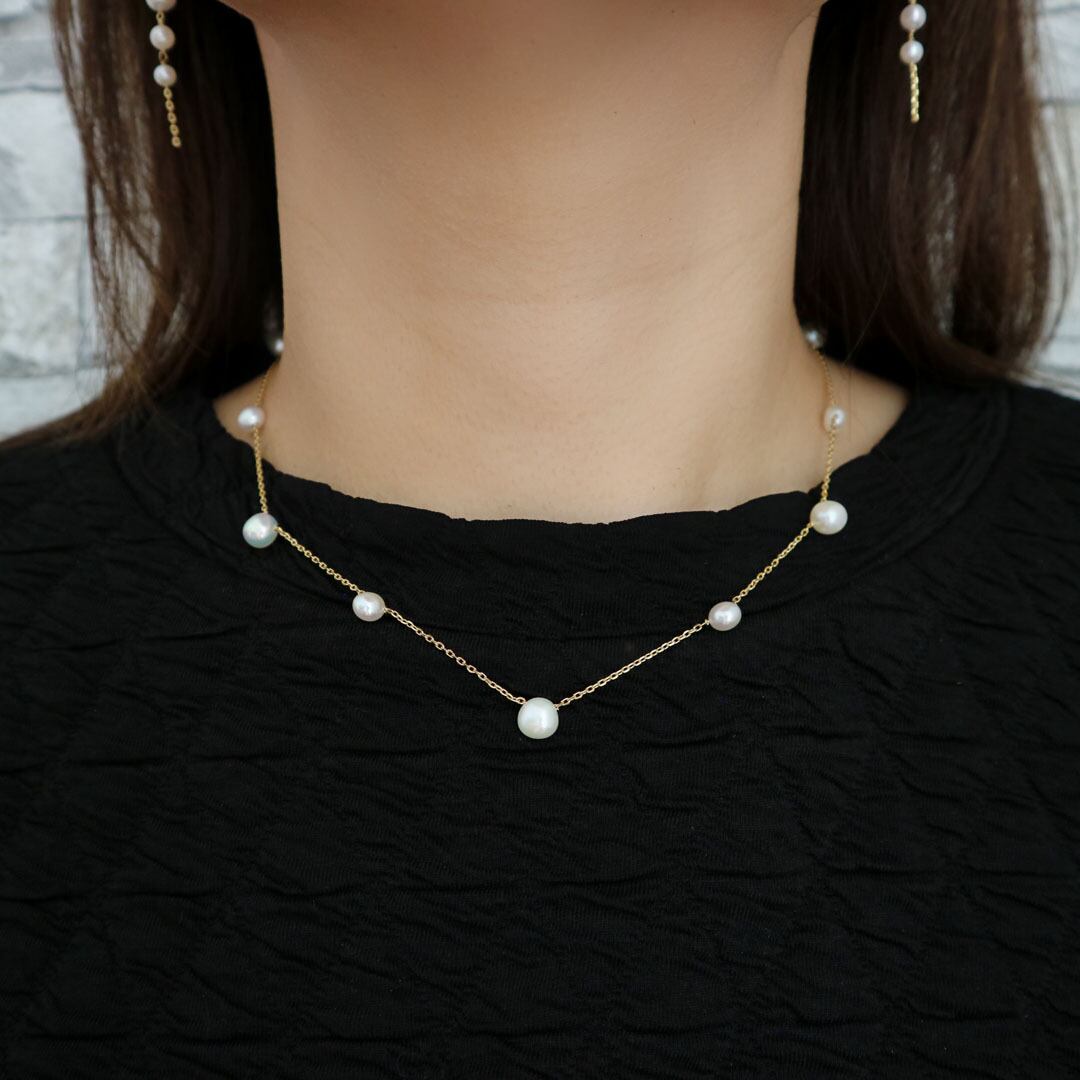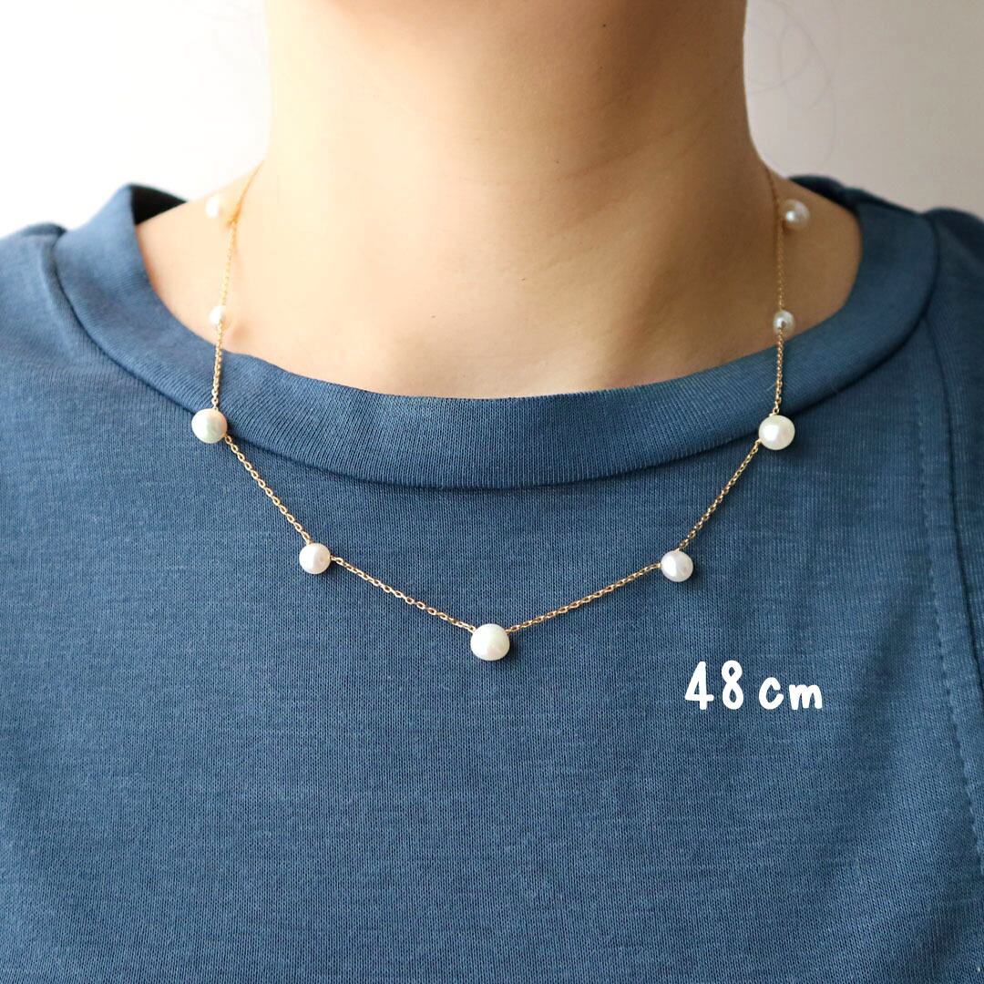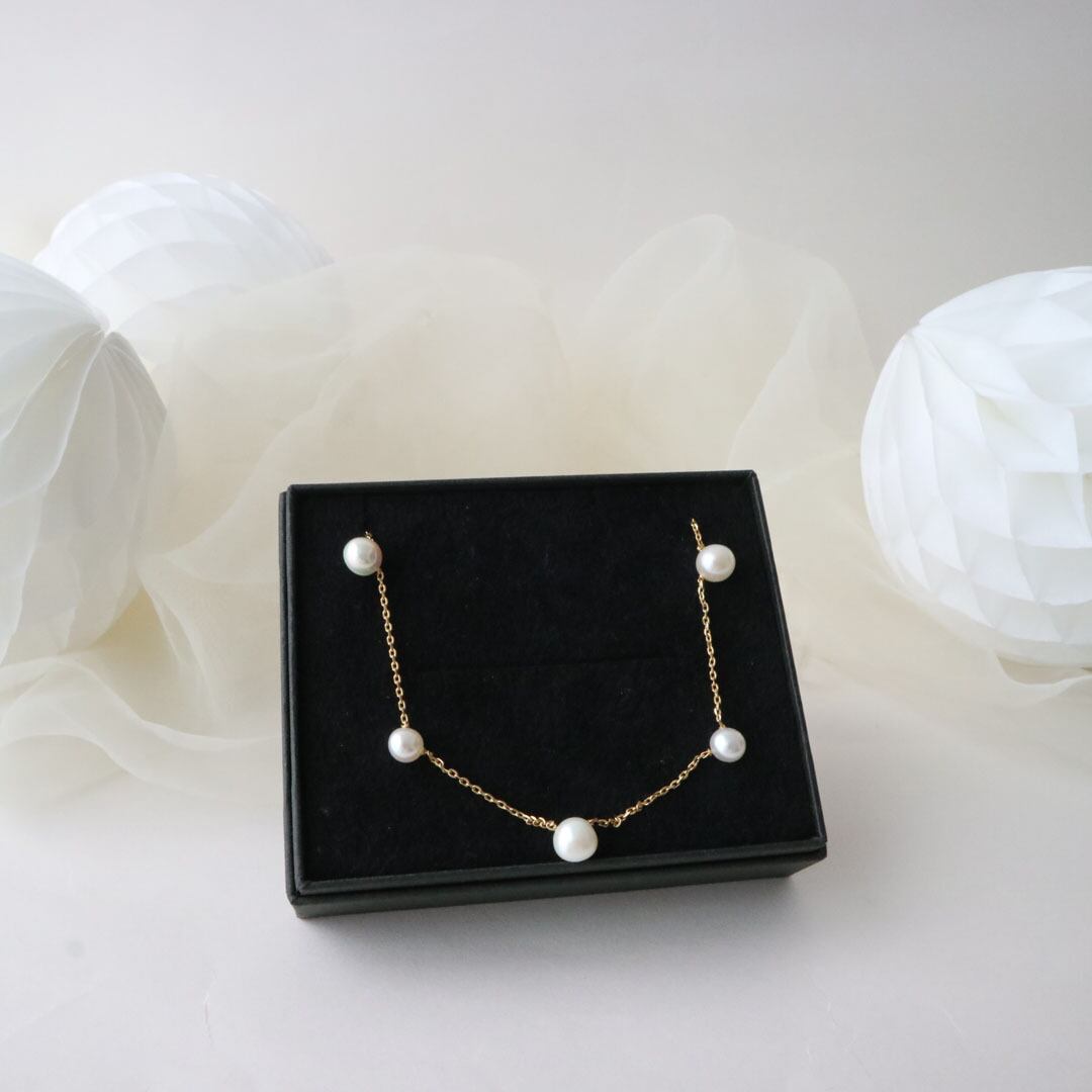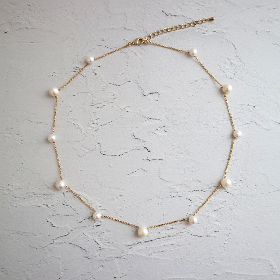 一粒ずつ均等に配置したドロップパールがエレガントなネックレスです。
