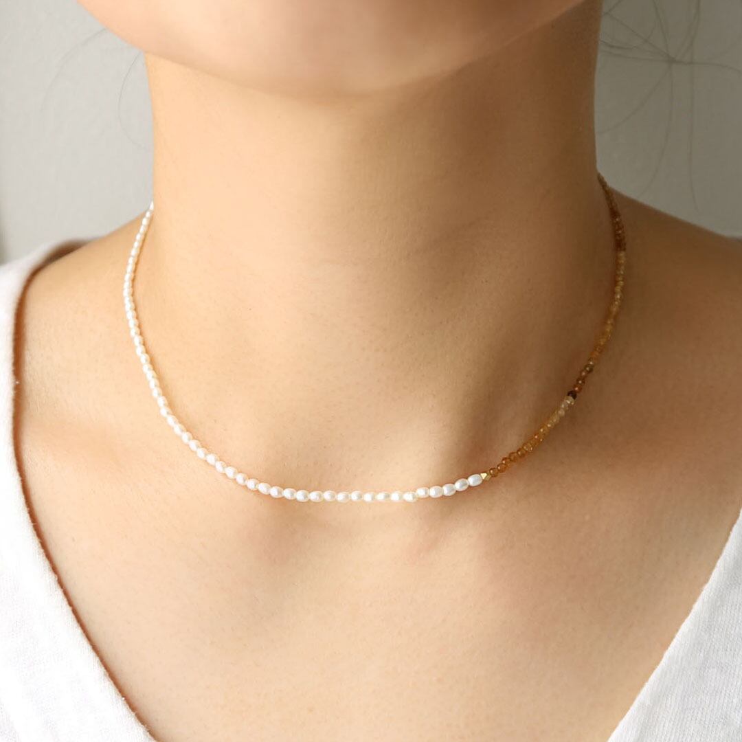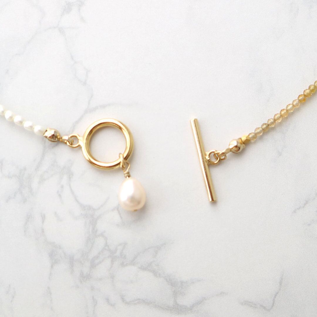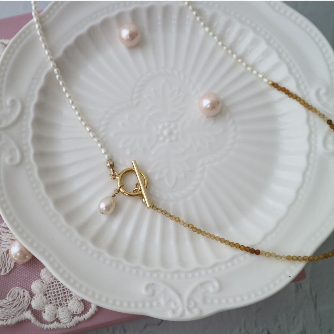 秋らしい色合いのイエロートルマリンと淡水パールのコンビネーションがとても素敵なネックレスです。
