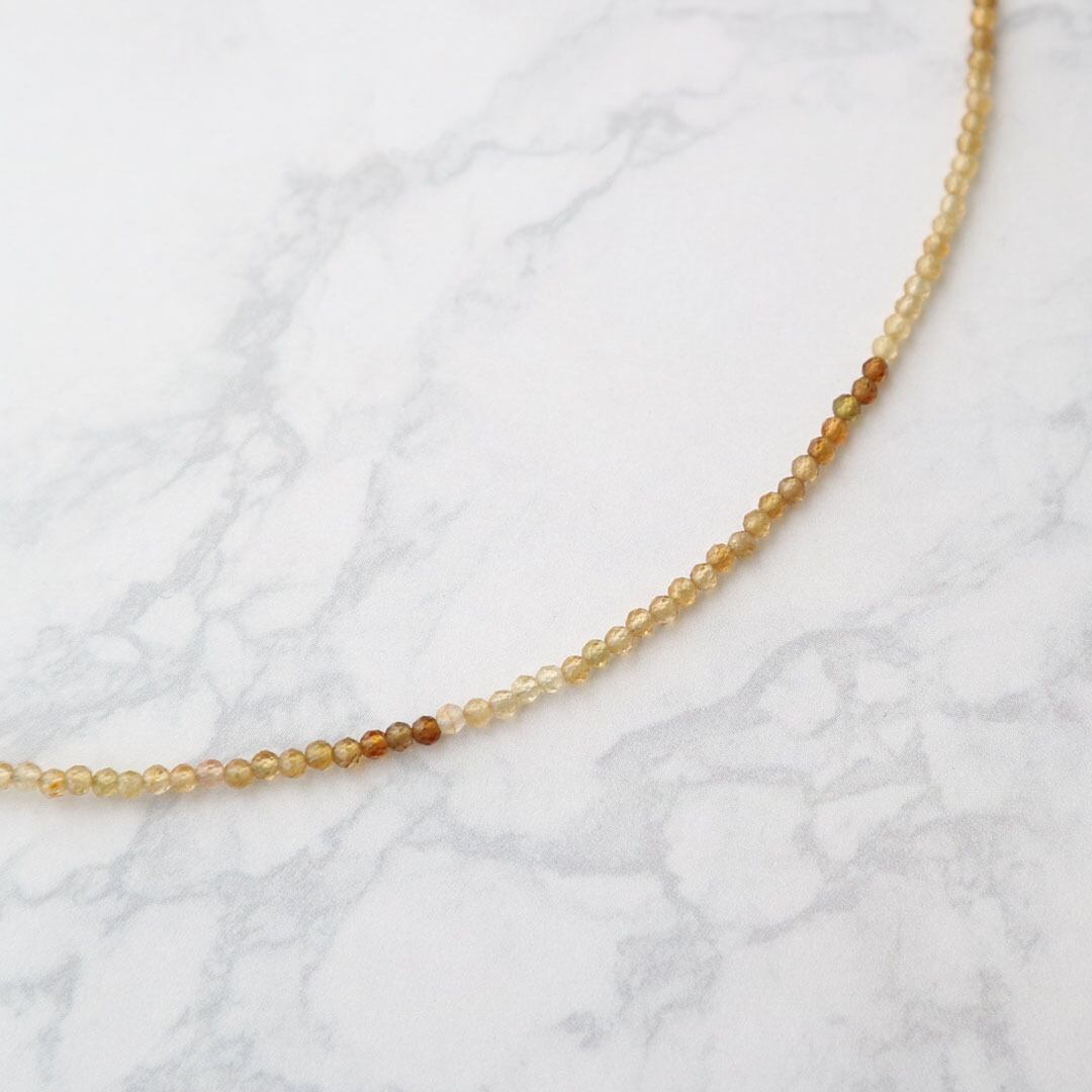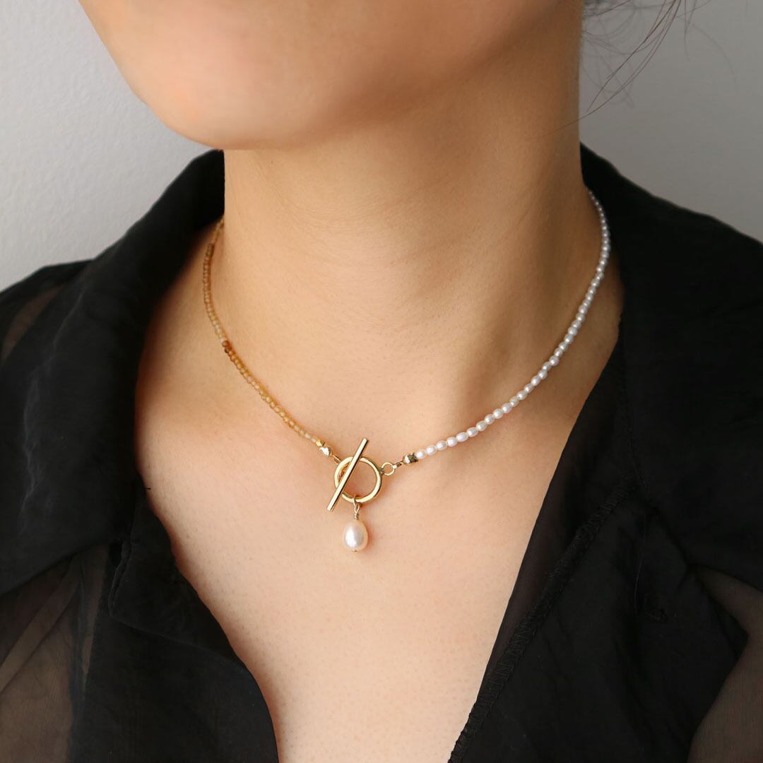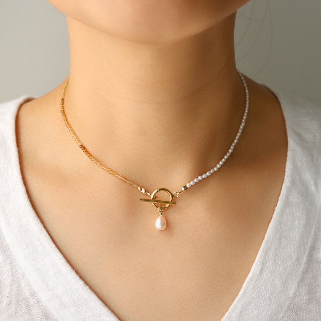 秋らしい色合いのイエロートルマリンと淡水パールのコンビネーションがとても素敵なネックレスです。